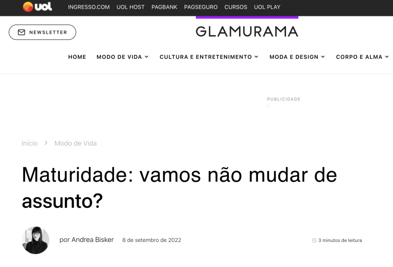 Criado pela jornalista Joyce Pascowitch e hospedado no UOL, o Glamurama é dedicado a contar histórias, conectar pessoas e antecipar comportamentos. Conheça os temas do Maturidades para palestras e talks. Leia o artigo na íntegra.