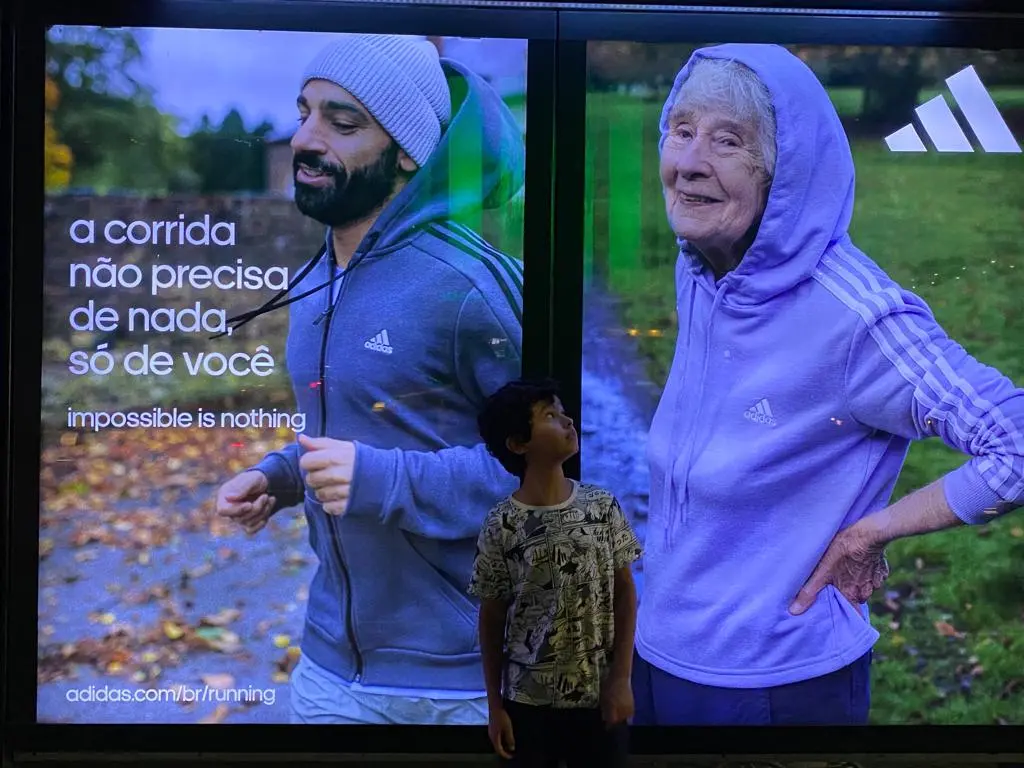 Em mais um capítulo da campanha Impossible is Nothing, a Adidas traz uma mulher longeva para o filme Running Needs Nothing But You. Desdobrada em outras peças publicitárias, a ação coloca lado a lado a modelo e o craque egípcio Mohamed Salah, atual atacante do Liverpool. A ideia é ilustrar a pluralidade da corrida como um esporte democrático, em que recordes e linhas de chegada são infinitos – para cada indivíduo. A foto acima foi tirada em um ponto de ônibus na Avenida Paulista, em São Paulo. Uma versão do filme está disponível no Youtube. Se você tiver um minuto – literalmente – assista.
